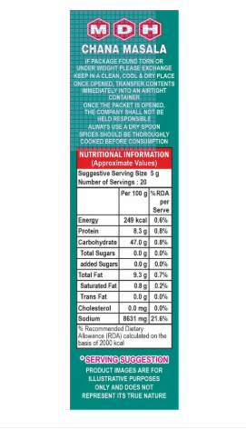 MDH Chana Masala is the perfect masala to enjoy your bhature. It is a blend of numerous aromatic spices that gives your chole a delicious flavour and an appetising aroma. Made from selected spices and dried ingredients carefully sourced from the best farms in the country. Prepared and packed in hygienic facility. Uses aunthentic recipe for traditional taste.