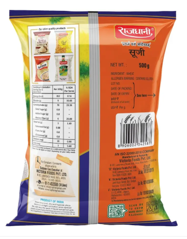 Made from the finest quality wheat grains grown in Deccan Madhya Pradesh, Rajdhani Sooji Flour is rich in protein and carbohydrate. The flour is carefully processed so that the nutrients are not lost during processing.